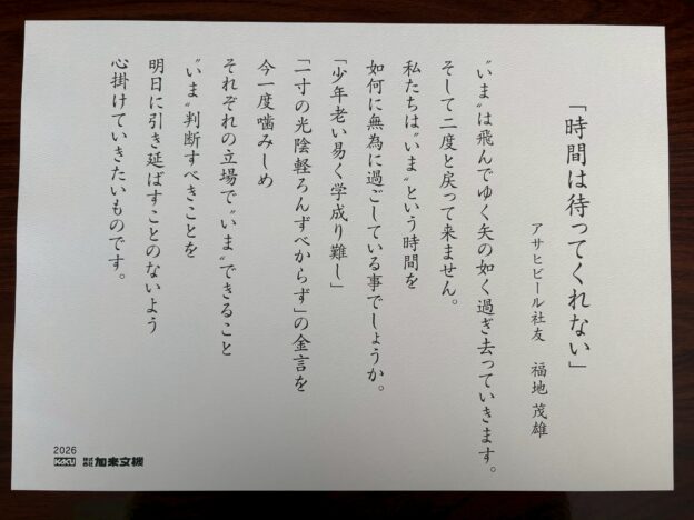 今年の新年挨拶状はアサヒビール、福地茂雄さんの言葉です。