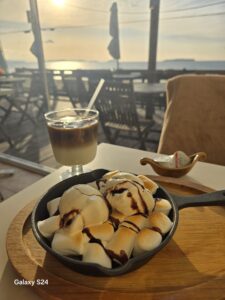 マシュマロとアイスがのったスイーツを食べながら、海を見ながらで最高のスイーツを